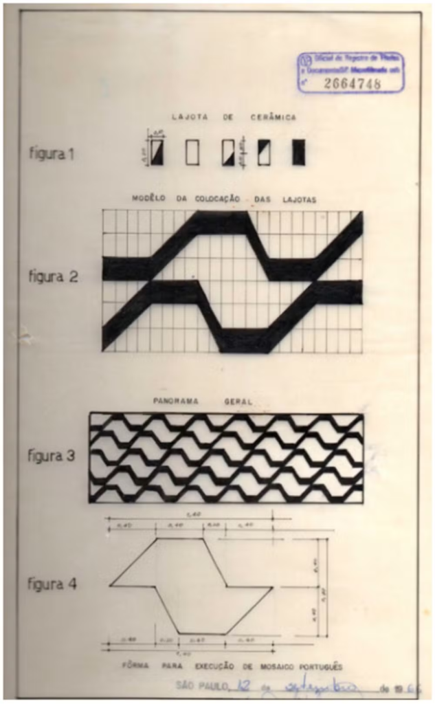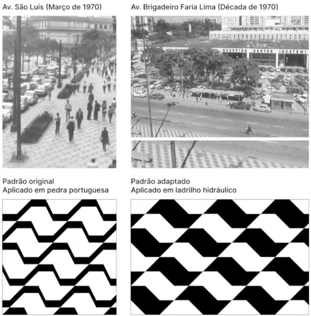 O desenho reaparece em ladrilho hidráulico na inauguração da avenida Faria Lima em 1970. “Os primeiros registros da imprensa que ressaltam a criadora e a entrevistam surgem com a chegada desta nova avenida”, relata Pablo.